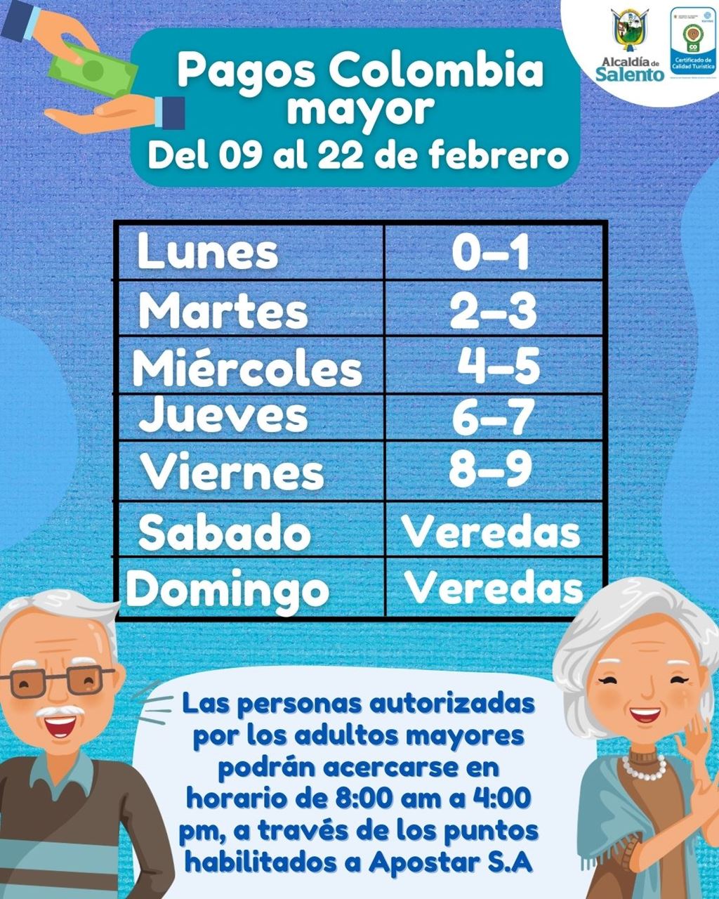 A todos los beneficiarios del programa Colombia Mayor les informamos, que se iniciará la entrega del ciclo 1 (enero 2024), a partir del 09 al 22 de febrero de 2024, a través de su operador bancario SUPERGIROS en los puntos Facilísimo de el Departamento del Quindío.💸