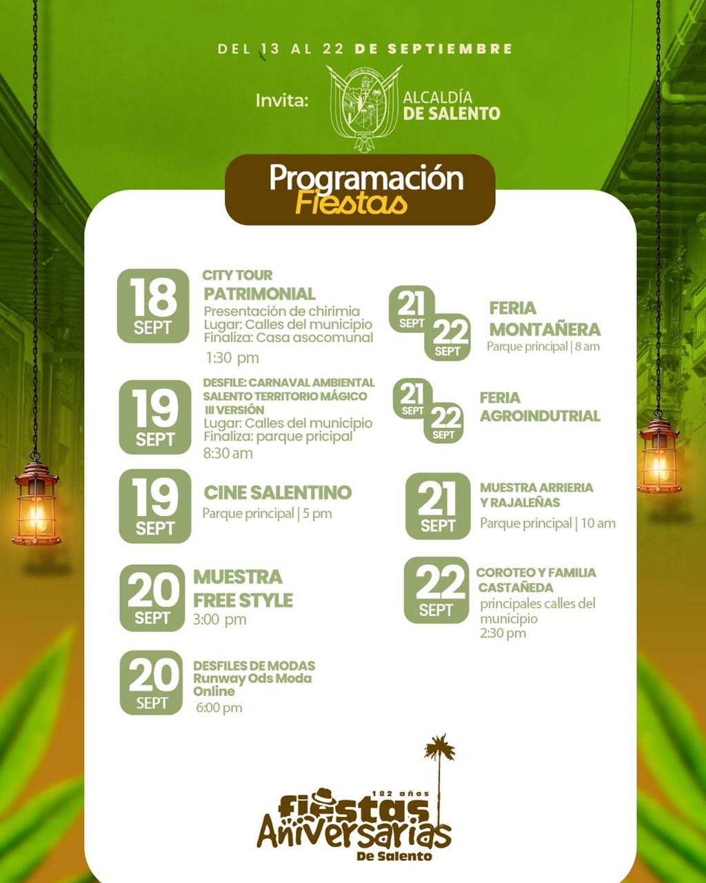 ​Conoce nuestra programación para la Fiestas Aniversarias de Salento, 182 años de Cultura y Tradición del municipio Padre del Quindío. Ven y acompáñanos del 13 al 22 de Septiembre, disfruta de una variada agenda Cultural y Deportiva.